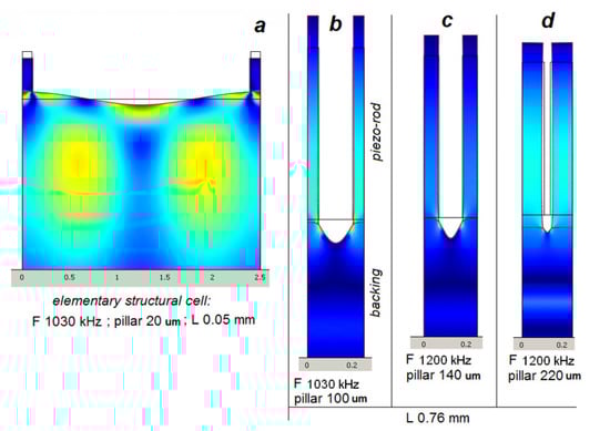 The waveform displacement and stress (von Mises) pattern in the resonating transducer structure at the fundamental SAW vibrational mode is shown in Figure 5. For a low (negligible) mass of tiny piezo-rods, the space SAW waveform is close to the ideal total sine period (Figure 5a). The effect of piezo-rod width variation on the stress distribution is demonstrated in Figure 5b–d. As seen from the simulation, the effective SAW in-depth into the backing equals to near same SAW wavelength, estimated as a motion intensity transition from the SAW to the bulk flat waves in the backing. For a narrower kerf (Figure 5d), the vibrational displacement is getting lower, so that in a limit of zero kerf (homogeneous piezo-plate) the SAW effect on backing disappears.