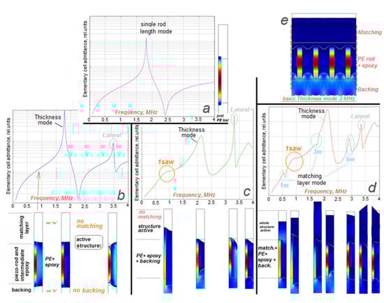 Figure 6. FEA simulation of the electrical admittance and stress, with consecutive structural complexity of the piezocomposite transducer in 2D model with a periodic elementary cell containing: a single free rod (a); just 1-3 piezocomposite plate (b); piezocomposite connected to the backing (c); full assembly with matching layer (d). The spectra include the fundamental thickness mode (e), piezocomposite lateral, backing boundary SAW, and matching layer resonances at the different assembly stages. Backing 4 mm; rod L 0.76 mm; pitch 250 μm; pillar 70 μm.