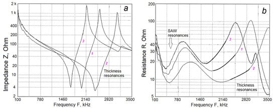The resistance R of the complex impedance Z characteristic was chosen as a parameter better reflecting the SAW resonance behavior with deep damping. In the experiments, the backing with quality factor Q ~ 5 (a mixture of tungsten powder and chips with epoxy) was connected to the piezocomposite plate through a thin layer of hard epoxy—on this stage just before connecting a front matching layer.