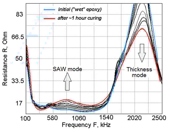 As the acoustical strength of the SAW effect is highly sensitive to the mechanical bonding between 1-3 piezocomposite plate and backing, to demonstrate the transient resonance characteristics caused by the bonding conditions, a piezocomposite plate was put on the backing with freshly prepared glue (LOCTITE hard epoxy). Then, the resistance R characteristics transformation in the glue curing process was further under monitoring. As shown in Figure 10, initially the piezocomposite just exhibits some damping on its basic λ/2 thickness resonance (as it is loaded with a lower-impedance epoxy liquid), then upon the bonding epoxy getting harder and solid, its intensity is further going down, while to the contrary the new SAW resonance aroused and strengthened. A novel resonance with nearly 2 times lower frequency is getting stronger, reaching its maximum strength when the bonding epoxy is completely cured. This resonance is identified as a SAW vibrational type that occurred on the backing boundary in the regular 1-3 piezocomposite, being out of the piezoelectric rods resonance in the structure at that frequency.