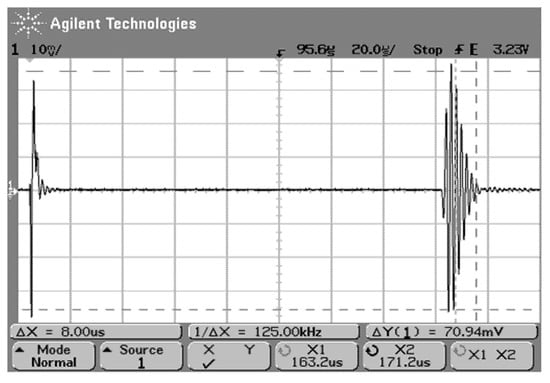 The transducer has been tested in both pulse-echo and pitch-catch modes. For a typical pulse recorded (Figure 11), with a spike input 400 V0-p, the signal output was ~70 mVp-p, with a transfer level −75 dB for a full 4” pitch-catch transmitter–receiver path in atmospheric air. The pulse has relatively short rise- and decay-times, with near 2 to 3 periods each.