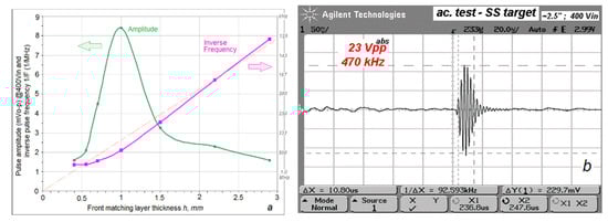 Figure 13. Experimental data of the pulse strength under variation of the matching layer thickness in a piezocomposite transceiver with SAW operational mode on backing: (a) signal amplitude and effective frequency of the pulse; (b) pulse waveform with maximum output.