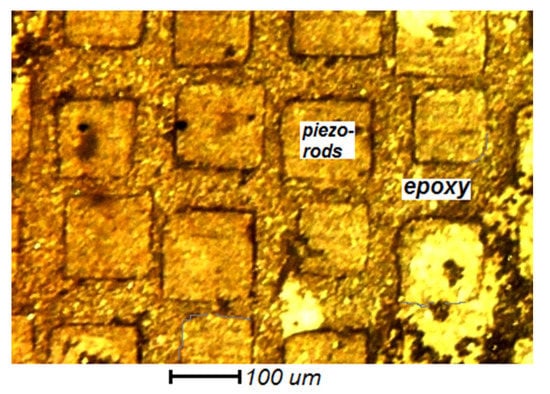 The general benefits of the 1-3 piezocomposite structure are higher thickness mode piezoactivity (rods with vibration of k33-type), lower frequency transverse (planar) unwanted modes, lower acoustical impedance, and transducer Q-factor. Several unwanted higher frequency lateral resonances caused by the regular piezoceramic-epoxy structure in piezocomposites are found and described in References [7,8,9,10,11]. To damp the unwanted resonances, an irregular piezocomposite structure is recommended at this point as in References [12,13,14].