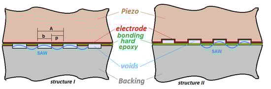 Figure 15. Alternative structures with a boundary SAW resonance effect using monolithic bulk piezo-plate—with shallow regular grooves at least on one of the boundary surfaces, piezoceramic and/or backing, as shown in structure I and II.
