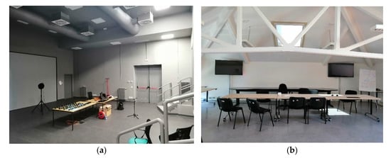All the measurements were performed according to the ISO standard 3382-1. The distance between two microphones’ positions was set at ≥2 m; the distance between both the microphone and the source from any reflecting surface (including the floor) was set at ≥1 m; the symmetric positions were avoided as far as possible. The source height was 1.5 m from the floor, while microphones were set at 1.2 m from the floor at the ears height of a seated person.