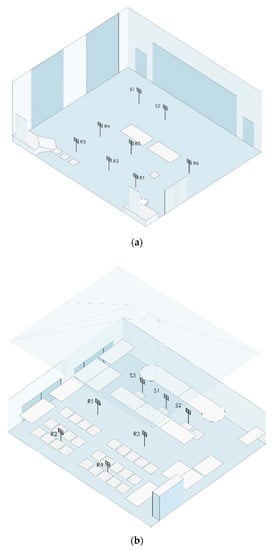 Layout of the measurement set-up in the two meeting rooms. S points represent the source position, while R points are the microphone positions in Mr1 (a) and Mr2 (b).