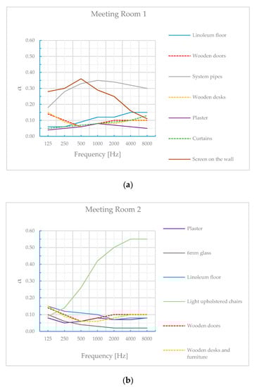 Octave band absorption coefficients assigned to materials for calibration in the two meeting rooms: (a) meeting room 1; (b) meeting room 2.