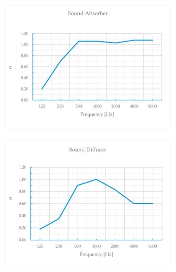 Octave band sound absorption coefficients of the absorptive and diffusive panels are shown in Figure 4. The weighted sound absorption index αw is also given, that is 1.00 and 0.65 for the absorptive and diffusive panel, respectively [37,38].