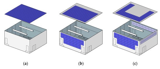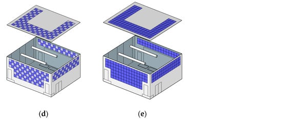 A trial and error procedure has been applied to obtain the optimal number of acoustic panels in each room starting from a baseline configuration, which is one of the most occurrent in practice, and that consists of the placement of sound absorption on the ceiling and at the upper part of the back wall (configuration b in Figure 5 and Figure 6). This solution limits the occurrence of flutter echo between walls as it is expected in configuration a where sound absorption is only placed on the ceiling [9,17]. The number of acoustic panels on the ceiling was increased step-by-step up to reach the optimal Reverberation Time in the range 0.125–4 kHz, with an error less than 5%. A total of 277 and 68 panels was obtained in the Mr1 and Mr2, respectively. These panels were then changed in position according to the different configurations detailed in Section 3.4.3.
