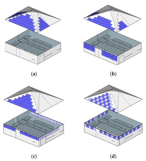 Proposed design solutions for the acoustic treatment in meeting room 2, for a total number of panels equal to 68. (a) 68 absorbers only are placed on three pitches of the hip vaulted ceiling; (b) 42 absorbers only are positioned on three pitches of the hip vaulted ceiling and 26 absorbers are placed on the rear wall; (c) 32 absorbers are positioned on one pitch of the hip vaulted ceiling, a row of 13 absorbers is placed on the upper part of the rear wall and a single row of 23 diffusers is placed on the front and one side walls; (d) absorbers and diffusers are alternated on one pitch of the hip vaulted ceiling and on the upper part of three side walls.