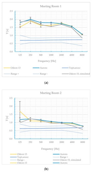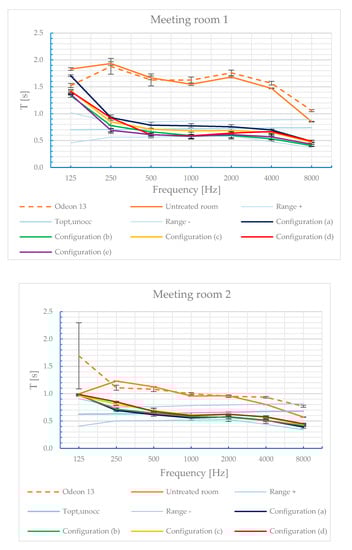 Almost a perfect match is obtained in the case of comparison between measured and simulated values in the untreated rooms, as expected after the calibration process described in Section 3.4.1. As shown in Figure 9, simulated Reverberation Time T20,0.125–4 kHz is equal to 1.69 s and 1.01 s in Mr1 and Mr2, that is +1.8% and −10.6% than the measured values with ODEON 13, respectively.