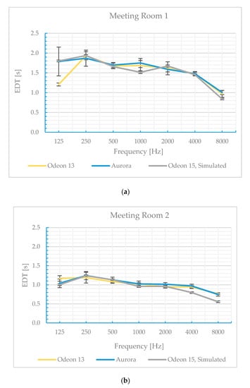 Octave band early decay time (EDT) measured in the Mr1 (a) and Mr2 (b) with ODEON 13 Room Acoustic Measurement System and the Aurora plug-in, version 3.0. The error bars represent the standard deviation across different measurement positions.