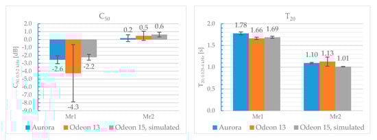 Comparisons between measured and simulated C50,0.5–2 kHz spatial average values in the untreated Mr1 and Mr2 are shown in Figure 9. Simulated values are far from measured values for more than the just noticeable difference (JND) of 1 dB [7] with ODEON 13 in Mr1. Only in the case of Aurora plug-in the simulated values are within the JND for both the rooms.