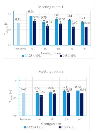 where Apers is the equivalent absorption area of the persons who overall can occupy the room, expressed in m2 [24]. Assuming 80% occupancy, which corresponds to an average of 10 persons in each rooms, the Topt,unocc resulted equal to 0.72 s in Mr1 and 0.65 s in Mr2. Both results relate to average values in the frequency range 0.125–4 kHz.