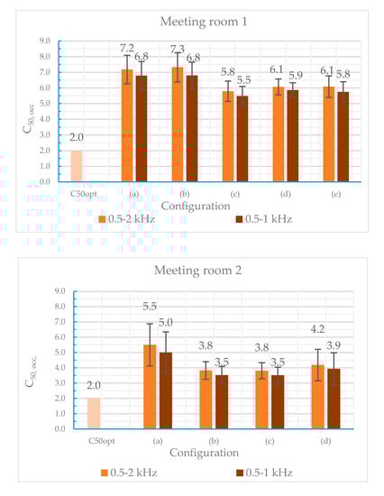 Typical values of the C50 vary between −1 and 1 dB, referred to performance spaces and rooms designed for music [7], while recently the new Italian standard UNI 11532-2 [24] refers to optimal values as C50, 0.5–2 kHz ≥ 2 dB in unoccupied rooms used for speech with volumes lower than 250 m3.