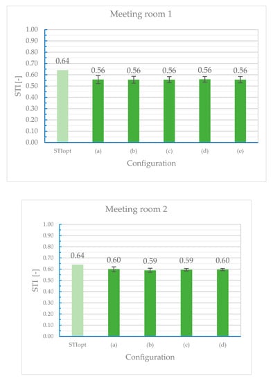 Figure 13 shows the comparison between the simulated STI (female) spatial average values in the Mr1 and Mr2, for the different design solutions shown in Figure 5 and Figure 6, with the optimal minimum value of 0.64. All the solutions are within the JND of 0.05 [40,41]. No difference is shown across the configurations due to the assumption of the presence of not such a low background noise level in the rooms corresponding to NC35 [5]. Higher average STI values of 0.6 are found in Mr2 compared to 0.56 in Mr1, but none reaches the optimal value due to the presence of noise.