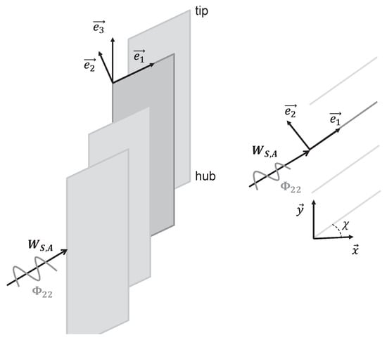 In this context, an oblique gust is understood to be a vortical disturbances featuring a spanwise wavenumber component, that is, . On the contrary, is equal to zero for parallel gusts (the wavefront is parallel to the leading edge of the blades). Finally, regardless of the dimension of the turbulence wavenumber spectrum, the same notation is used to denote the upwash velocity component. The dimension of the function is indicated by the number of dependent variables.