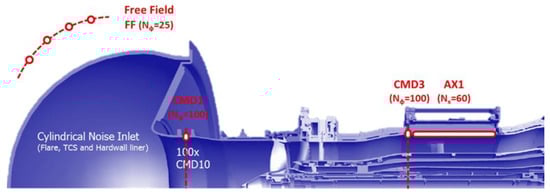 A short description of the TurboNoiseBB test campaign, which provided the validation data for the benchmark, was given by Guérin et al. []. Specific details on the instrumentation and data post-processing can be found in several publications [,]. The ACAT1 fan is a transonic fan composed of 20 rotor blades and 44 stator vanes. A longitudinal cut of the AneCom test rig is shown in Figure 2. The noise instrumentation is highlighted in red. Two configurations with different rotor–stator gaps were measured in the project TurboNoiseBB but only the short gap variant was considered for the benchmark. Furthermore, the focus was restricted to the three operating conditions relevant for acoustic certification: Approach, Cutback and Sideline. These points were distributed along a single, the so-called “Sea Level Static” working line. Note that the stator geometry was simple, with no lean and nearly no sweep. According to Hanson [], sweep has no significant effect for low angles as the impact on the peak amplitude is approximately proportional to the cosine of the sweep angle , hence .