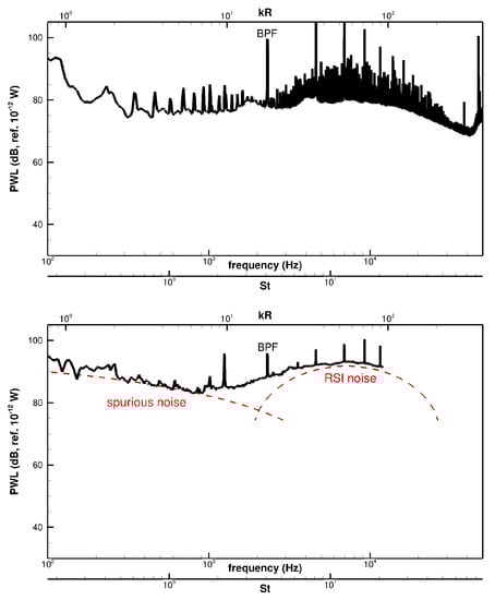 The acoustic results for the Sideline conditions are shown in Figure 3. Two curves were drawn per hand on one of the graphs to exemplary suggest the presence of at least another source of broadband noise besides rotor–stator interaction (RSI) broadband noise. The peak frequency of RSI noise is approximately 3 times the blade passing frequency (BPF), which is close to the empirical factor of 2.5 proposed by Heidmann []. The Strouhal number given in x-axis of the graphs in Figure 3 is defined in accordance with Kissner et al. []: , with f the frequency, m the radius at the duct casing upstream of the stator leading edge, and (≈240 m/s at Sideline) the averaged flow velocity upstream of the stator. The second non-dimensional number shown on the top x-axis of the graphs corresponds to the Helmholtz number. This number permits to identify the frequency range within which pressure peaks, produced by acoustic duct modes while they become cut-on, are likely to be visible (typically for ).