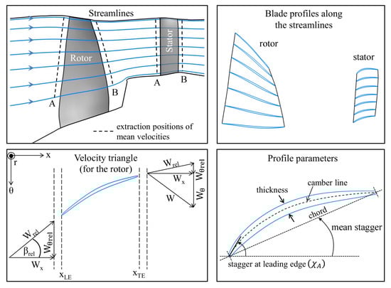For a given operating point, all the acoustic simulations were based on the same input obtained by analysing the geometry and the flow solution of the RANS calculation. The data analysis—done with the DLR in-house tool C3D_T2P []—was conducted at 97 radial positions equally distributed along the whole span (see Figure 4). The streamline positions in the -plane were determined after having circumferentially averaged the mean flow. Only the part of the flow going into the bypass duct was considered in the prediction. Thus, the interaction with the Engine Support Stator (ESS) located at the core entry was ignored. For each radial position of the stator, the following values were provided: the axial and tangential speeds up- and downstream of the stator (see Figure 5), the turbulent kinetic energy and the turbulence length scale (see Figure 6). Additionally, averaged values of the speed of sound and of the mean flow density calculated upstream of the leading edge were provided. Only one acoustic code was able to consider the real profile of the airfoil. In the other models, the stator vanes were discretised into flat thin plates, whose stagger angle varied along the span (see Figure 7).