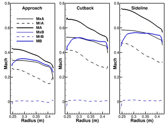 Spanwise distribution of the axial (), tangential () and absolute (M) Mach numbers obtained by circumferential averaging at positions A and B, respectively located at one quarter chord length upstream of the stator leading edge and one quarter chord length downstream of the trailing edge (see positions A and B approximately indicated in Figure 4).