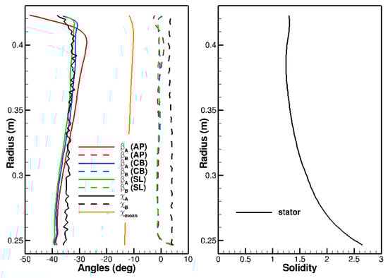 Spanwise distribution of (left) the flow () and stator () angles, and of (right) the stator solidity (chord-to-pitch ratio).