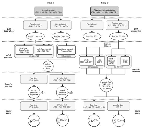 The methods used for the benchmark were classified into two different categories. The result of that classification is shown in Figure 8. One group contains methods that explicitly refer to the acoustic analogy, while the other group contains methods that rely on a direct calculation of the pressure cascade response: