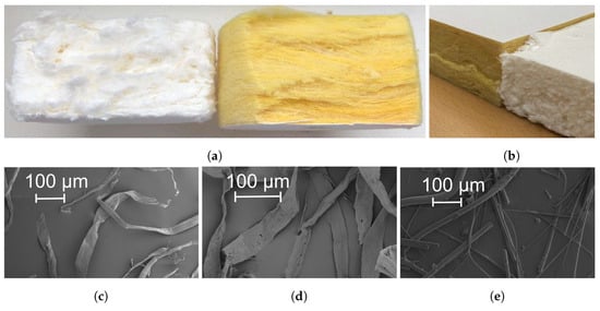 (a,b) illustrates the cross-sectional porous structure of bioboard and glass-wool, for the impedance tube samples, and the samples used for the determination of incidence angle-dependent sound absorption coefficients. (c–e) show scanning electron microscopy images of dissolving hardwood, bleached softwood and glass fibers, respectively.