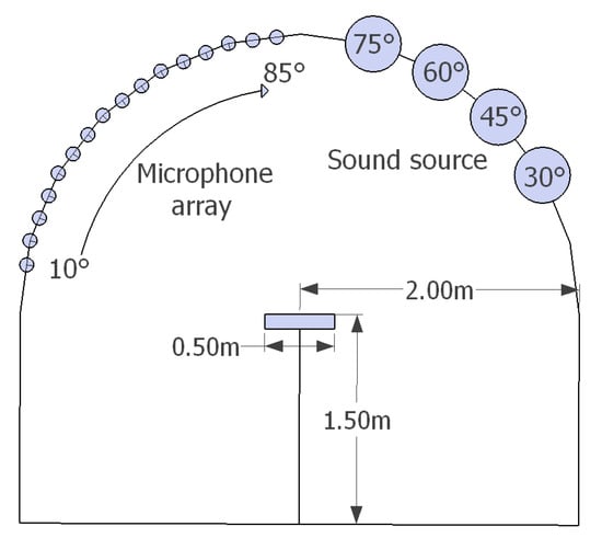 The spatial distribution of the first sound reflections from the studied materials, i.e., the polar responses, was determined according to the method described in AES-4id-2001 [19]. The polar responses were obtained in a single plane using a 2D-goniometer, as shown in Figure 2. In this setup, half of the semicircle was used for the receiver array, and the other half for the sound source. A total of 16 omnidirectional measurement microphones (1/4-inch, model Superlux ECM-999) were fixed to the semicircle with an angle interval of 5, from 10 to 85. Shock mounts were used for all the microphones to prevent transmission of structural vibrations. The sound source, YAMAHA HS5, had a flat frequency response (74 to 24 kHz, at −3 dB), and it was movable between 0 and 85. Four angles of sound incidence, 30, 45, 60, and 75 were considered sufficient for the purpose of this study. The distance between the microphones and source to the sample under test was two meters.