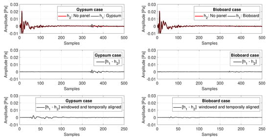 The process to extract the reflection from the panel under test. On the left, responses measured for a gypsum panel; on the right, responses measured for a bioboard panel.