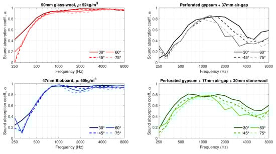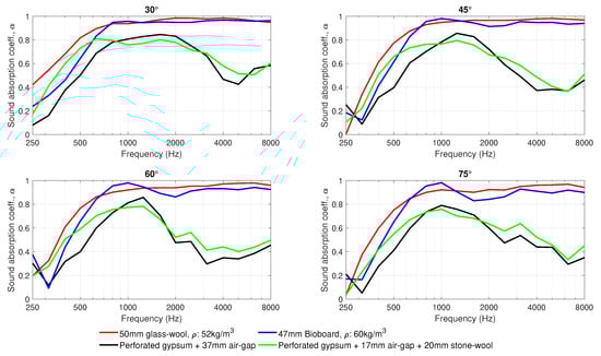 In general, as shown in Figure 7 and Figure 8, the deviation in the sound absorption coefficients measured for the incidence angles 30, 45, 60 and 75 are rather small. However, the difference at the lower frequencies increases with increasing off-normal incidence angle. Similar results have been reported in [29]. Another relevant difference in the angle-dependent measurements is the change in the angle of sound incidence in the dip appearing at 2000 Hz for the bioboard sample. Such fluctuations are typical in normal incidence sound-absorption measurements, and they tend to disappear in diffuse field measurements, as seen in Figure 9. Figure 8 reveals that those dips also tend to vanish with decreasing angle of sound incidence.