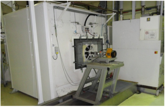 At the end of the aerodynamic tests, acoustic measurements were taken in a semi-anechoic chamber at the nominal rotational speed of each of the fans (Figure 4). Measurements were taken on the axis of rotation of the fan, at a distance of 1 m from the front face of the fan hub and at a height of 1 m. The cooling module is suspended accordingly by flexible fasteners to filter out vibrations.