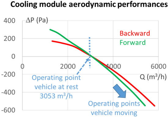 For the two fans considered, the aerodynamic performance is obtained in the complete cooling module for rotational speeds of 2404 and 2615 rpm, respectively, for the fans BW and FW (see performance curves in Figure 5). At this operating point, the pressure increase given by the fan perfectly balances the pressure losses, and the upstream and downstream pressures are equal to zero (zero pressure point). This should correspond to the condition for which a vehicle is at rest and does not benefit from the dynamic effect of air when the vehicle is running. In reality, the additional pressure drop of the air intake (grid, vehicle front end) and engine compartment is not taken into account in this case, which is why the operating point incorporates a certain safety margin. Fortunately, this additional pressure drop is quickly erased as soon as the vehicle moves forward, and at high speed the cooling module generally resists air with a fan that ends up being a turbine (i.e., it is the fluid that gives its energy).