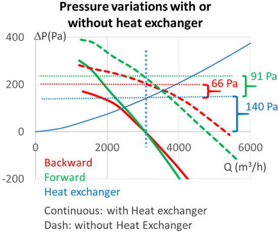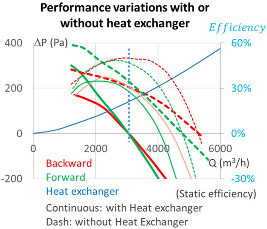 It should be noted that the forward blade undergoes practically no torque variation (1.55 vs. 1.53, respectively, with and without the exchanger, i.e., ~1%), while it is largely modified for the backward curvature (1.51 vs. 1.39 respectively with and without the exchanger, i.e., ~9%). Regarding combined effects of both pressure and torque variations, the static efficiency changes from fan alone to the module configuration are about the same for the two fans, i.e., −11% and −11.4%, respectively, for the backward and the forward curvatures (see Figure 8).