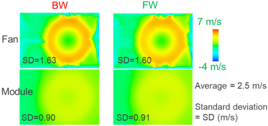 The inhomogeneity of the flow is measured by comparing the deviation to the mean for each configuration. It is obtained by calculating the root mean square of the deviations from the average pondered by the surface. Standard deviations are in fact rather equivalent between the two fans: without the radiator, values are 1.63 and 1.60 m/s, respectively, for the backward and forward configurations, and 0.9 and 0.91 m/s, respectively, with the radiator. As these values are very close from one fan to the other, it is remarkable to note that both are showing a similar behavior in terms of flow distribution on the heat exchanger despite their strong geometrical differences. In fact, it can be assumed that the change of velocity given to the fluid by the fan is set by the same operating point, which explains the same flow rate distribution. The major effect is related to the presence or not of the exchanger, which promotes homogeneity by reducing the deviation from ~1.6 to ~0.9 m/s.