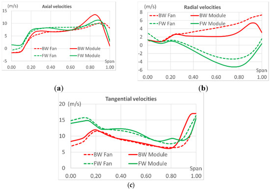 Velocity components are averaged in the azimutal direction and are shown in Figure 11. Axial velocities are relatively similar for the different cases, with, however, an acceleration of the flow velocity at 80% of the span for the backward fan in the module configuration. It should also be noted that the backward-curved fan produces an overall less tangential velocity and it is compensated by a largely positive radial velocity, whereas the forward curvature tends to create negative radial velocities. Some authors have already presented some effects of sweep or lean modifications [6,7,8,9,11,18], and it explains, for instance, that the blade curve creates a force acting on the flow that has a direction perpendicular to the surface of the pressure side. In the case of a forward fan, this force would be centripetal, and centrifugal in the case of a backward curvature.