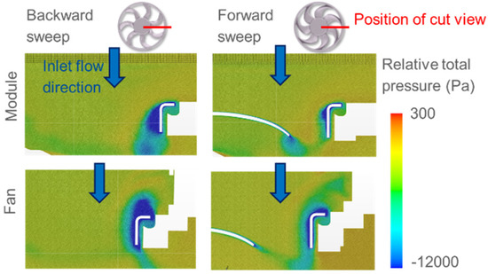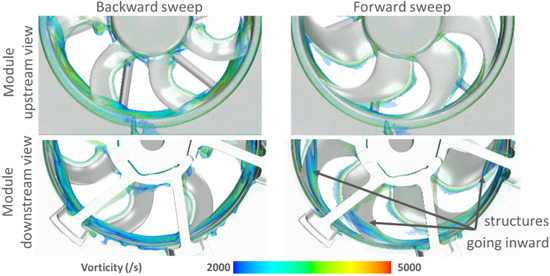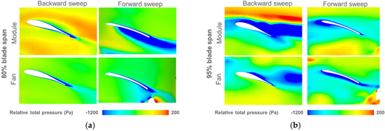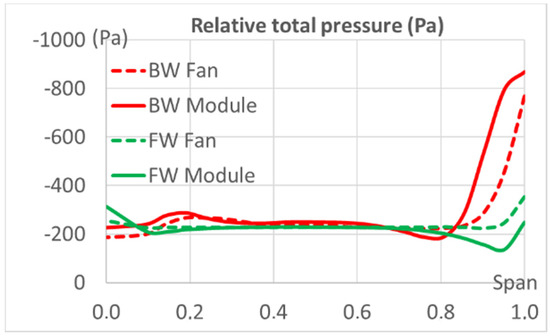 More radial flow as it exists for the backward fan tends to increase the load near the blade tip, roughly at 80% of the span (as described above). This is accompanied by a rather disturbed flow near the rotating ring, where more relative total pressure deficit is observed and presented with a circumferential averaging behind the trailing edge in Figure 12. Phenomena can be further analyzed in Figure 13, where it appears that a more important region of relative pressure loss is observed for the backward fan, nevertheless with a different pattern whether it is in the fan system (i.e., without the heat exchanger) or in the module configuration (i.e., with the heat exchanger). In the first case, the low pressure area extends upstream, while it goes on the internal surface of the rotating ring for the second case. This is obviously the effect of the radiator resistance, which creates more suction effect on the side of the shroud and which pulls the area of losses towards the blade heads.