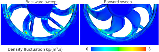 A post-processing of the density on the walls at each time-step during the fan rotation highlights the spatial and temporal variations. It can be illustrated by a rate of change (here in kg/m3/s) as in Figure 16, for a given time. It indicates qualitatively the main location of the sources at the top of the blade, and to a lesser extent at the blade bottom for the backward fan. The latter generally produces more intense fluctuations, partially extending over the rotating ring. These observations are consistent with the hypothesis that flow disturbances and acoustic sources are related.
