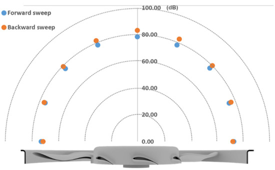 From an acoustic point of view, the study confirms that the forward curvature has better acoustic properties, which can be explained by the smaller surface with intense dipolar sources at the blade tip and a lower propagation intensity in the direction of the axis of rotation (on which the measurement is made).