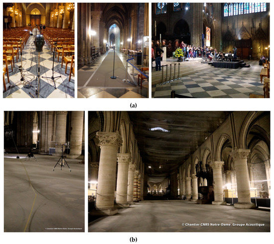 - Postma, B.N.; Katz, B.F.G. Acoustics of Notre-Dame Cathedral de Paris. In Proceedings of the International Congress on Acoustics (ICA), Buenos Aires, Argentina, 5–9 September 2016; pp. 0269:1–10. [Google Scholar]