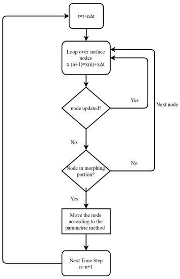 To drive the dynamic meshing schemes in ANSYS Fluent, a UDF was developed to incorporate the unsteady parametrization method explained in Section 2.2. The UDF makes use of the DEFINE_GRID_MOTION macro embedded in Fluent, and follows the algorithm illustrated by the flowchart in Figure 1. The source code of the UDF was realised as an open source [58].