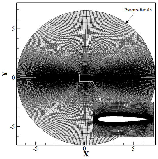 The flow domain consists of a NACA 0012 airfoil with a sharp TE, the pressure far-field was placed at least 30 chord lengths (c) from the TE, and a structured O-grid type mesh (Figure 2) was generated around the airfoil. Three sets of meshes were generated to determine mesh independency. The sizes of the grids were 60k, 100k and 400k cells for the coarse, medium and fine grids, respectively. The number of points on the surface of the airfoil ranged from 600 to 1600 points for the fine mesh. The distribution of points on the airfoil was achieved using a hyperbolic function with points clustered near the LE and TE (spacing of 10−4 m) in order to capture fine geometric features. The inflation layer was refined to achieve a y+ between 0.5 and 1 for the first layer on the wall. A cell height of 8 × 10−6 m was chosen in order to satisfy such requirement, with a growth rate of 1.1 away from the wall. The grids were created in an iterative process to be suitable for the acoustics application, therefore over 90% of the grids created have a CFL number less than one, in which all grids in the near field regions around the airfoil have a CFL less than one. This choice is deemed sufficient for the present tonal noise investigation [59].