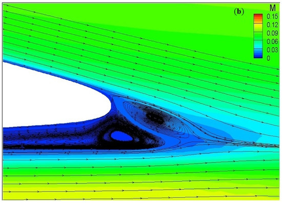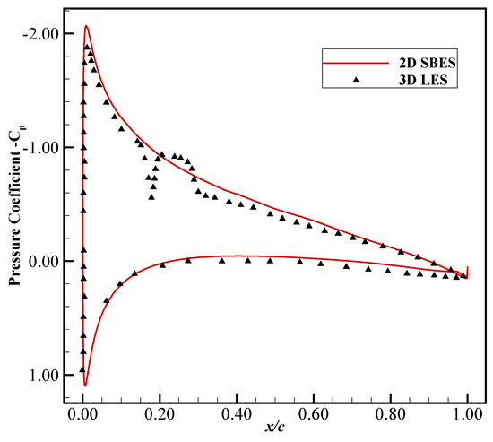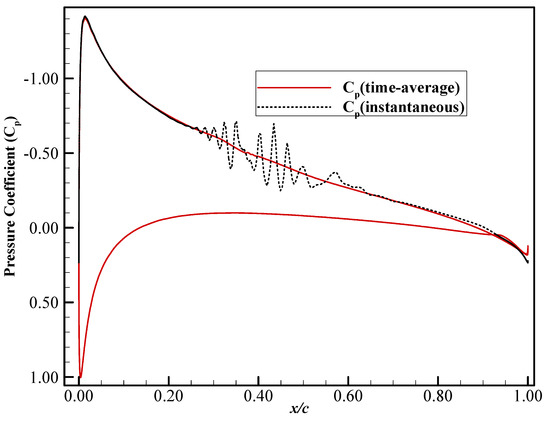 Figure 3 presents the instantaneous lift and drag coefficients data, the mean (time-averaged) values are compared with published numerical results from an unsteady RANS study by De Gennaro et al. [46] and with experimental results for a Reynolds number of 0.7 × 106 of Sheldahl and Klimas [61]. Table 2 summarizes the time-averaged aerodynamic coefficients compared with published data. The lift coefficients for all studies compare well. For the drag coefficient, the SBES and URANS results have shown a 5.33% difference. Compared with the experimental study, both SBES and URANS under-predict the drag by 9.63% and 12.34%, respectively. The presence of the LBL instabilities is confirmed by various fluctuations presented on the suction side of the instantaneous pressure coefficient plot (see Figure 4). Later, LBL instabilities move downstream to interact with the laminar separation bubble presented near the TE on the pressure side.