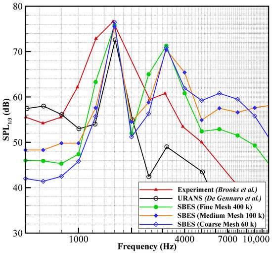 The SBES over-prediction might originate from the LES region of the flow, since the pressure fluctuations do not dissipate in the spanwise direction causing an over-prediction especially in high frequency regions (corresponding to small turbulence eddies). A similar over-prediction was observed in previous 2D studies ([48,52,65]). Finally, De Gennaro et al. [46] showed that the weight of the broadband component is negligible in the third octave band which might explain why the SPL of the main peak is not affected.