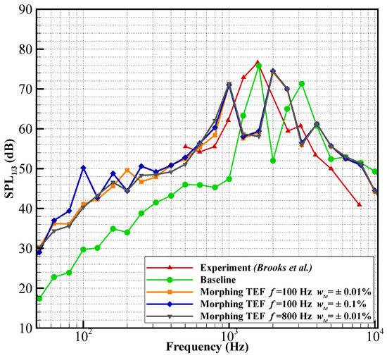 SPL in one-third octave band comparing the baseline NACA 0012 SBES results to the morphing TEF cases; wte = ±0.01%, ±0.1%, for f = 100 Hz and 800 Hz. Experimental data from Brooks et al. [36] are also plotted for reference.