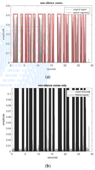 Temporal analysis of a test signal (a) speech activity zones (b) filtering the non-speech activity zones.
