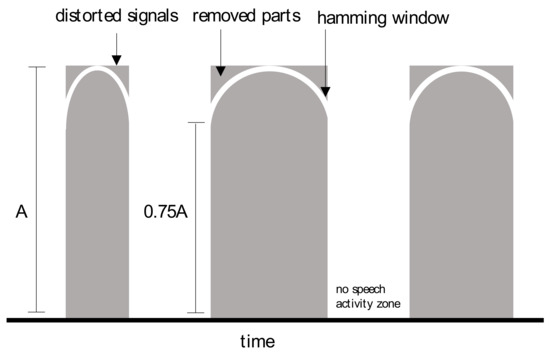 Another method to mitigate the distortion effect for the audio signal is to employ a windowing technique for decreasing the sharpness of the raw signal and hence to reduce the THD. The window should soften the signal edges transforming the wave to a more sinusoidal shape (Figure 4). There is a trade-off between the signal loss and the operation of such a technique. It was found that the hamming window modulates the envelope of the source signal where the peak reaches the maximum range of the speech activity zone, as shown in Figure 4. The hamming window was shifted to preserve 75% of the original signal.