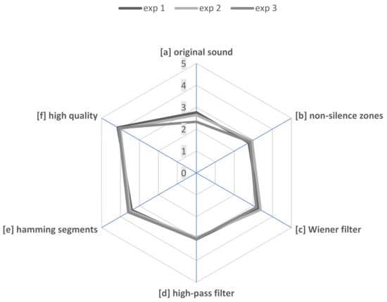 Results from subjective tests carried out in compliance with the ITU-T Recommendation P.835 are given in Table 3, where each run summarizes an average of four audio clips. Each of the six test methods ([a]–[f]) was run 3 times and each of them contained 4 audio clips generating 72 tests (=6 × 3 × 4). The average score as well as the standard deviation of each test was determined to maintain consistency. A high quality test of the high-precision Rode NT1-Kit microphone was also conducted and treated as a reference signal (Figure 6).