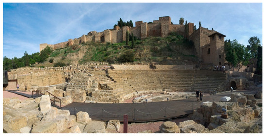 - Corrales, M.; Fernández-Baca, R.; Tejedor, A. El Teatro Romano de Málaga: Investigación, Conservación y Valorización The Roman Theatre in Malaga: Research, Conservation and Enhancement. In Proceedings of the Congreso Internacional de Restauración, Restaurar la Memoria, Valladolid, Spain, 12–14 November 2004. (In Spanish). [Google Scholar]