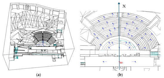 For the geometric survey, a three-dimensional model in unoccupied conditions is generated by the SketchUp software (Trimble, Sunnyvale, CA, USA), and finally imported through the SU2CATT v1.3 plugin (Akustikbüro K5, Berlin, Germany). The final model presents 1730 plans and 1037 m2 of audience surface without spectators, with a cavea diameter of 45.6 m as currently preserved, although it was originally 64.5 m. The final model reflects the current environment of the theatre, the street in front of the theatre, and the buildings with the hill and the Alcazaba standing at the top of the slope (Figure 4a).